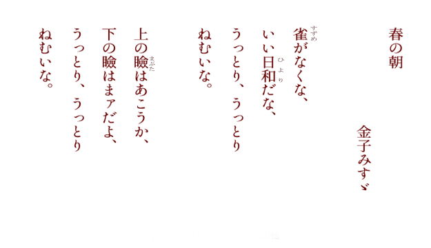 暖かくなってくると、ウトウト眠くなるそのひととき、なんとも言えない時間ですよね。でも、この上の瞼の感覚は分かるんですが、下の瞼の意識、これはこの詩を読んで初めて、ハッとしました。確かに、目を開けたくない時の感覚、皆さんぜひ目をつむって、眠たい時の目を開けたくない感覚、開けようとして開かない、その動作をちょっと真似してみてください。下の瞼の「まァだよ」がよくわかります。金子みすゞさんは、本当に細やかな感性をしていますね♪